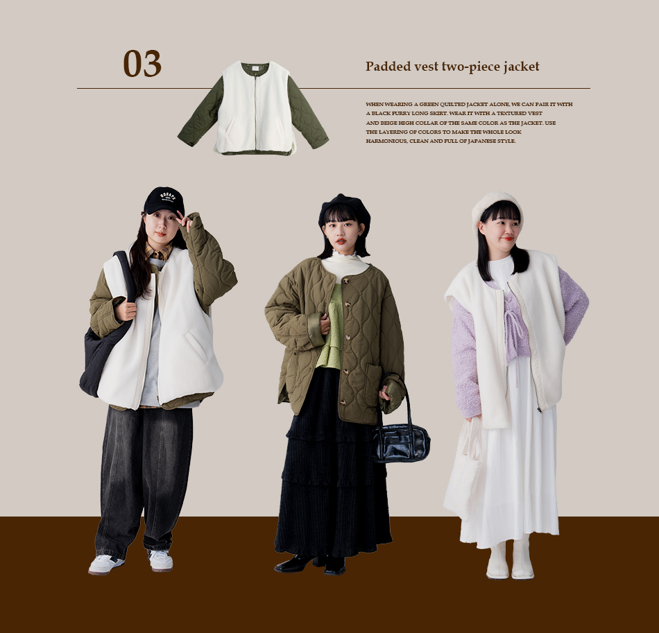 輕鋪棉單品完美迎合台灣冬天氣候,它能夠駕馭日常的休閒搭配,也能夠做一時髦單品為穿搭進行點綴,本期我們將外套融入日系穿搭中,小編一穿上彷彿走上日本街道中,富有滿滿日系韻味。