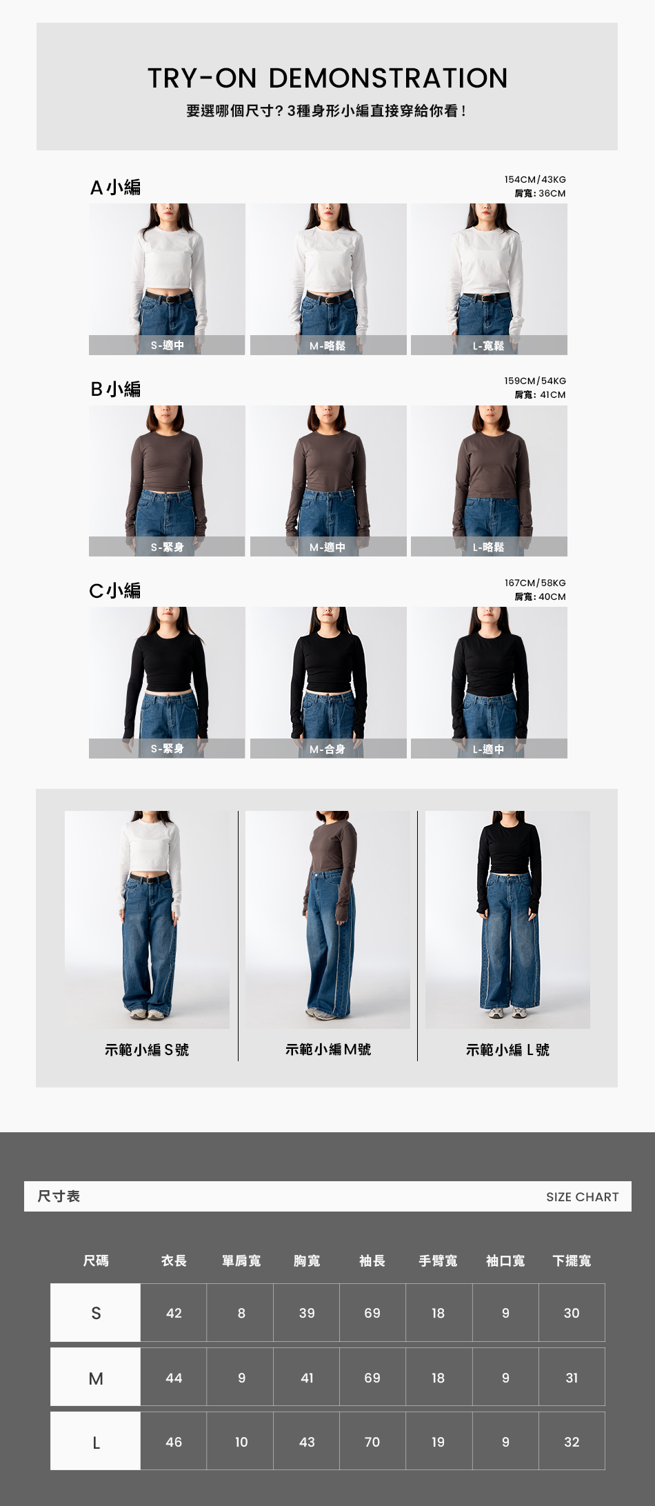 這次我們準備了多尺寸實穿示範,讓大家能清楚看到不同身形、不同尺寸所呈現的版型差異。